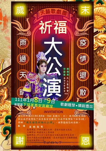 雨過天晴、疫情退散【歲末謝恩-祈福大公 演】,演出團體「屏東天藝歌劇團」創辦人林聖淵先生,受戲曲博士-康素慧老師提攜,過去多為支援知名大型歌劇團演出。「天藝」甫於2021榮獲中華民國文化部補助,受主辦單位-新港東天上聖母會邀約,擔綱本次公演活動演出團體,謝恩下茄苳泰安宮天上聖母護佑群黎之恩澤,祈求國泰民安、風調雨順!