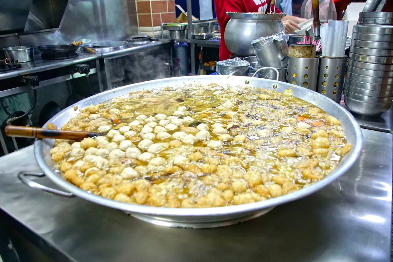 什菜湯,台語說「雜菜湯」,由高麗菜、白菜、香菇、筍乾、魚丸、豆皮等十多種食材一起熬煮,湯頭微甜、帶一點鹹香,不油不膩,喝起來就是一種很「家常」的溫潤感。這不是華麗的湯品,但每一口都喝得出老味道,尤其深夜來上一碗,更讓人覺得暖心。
